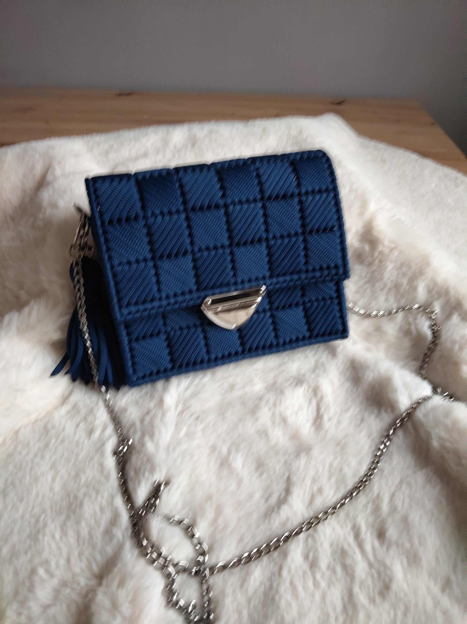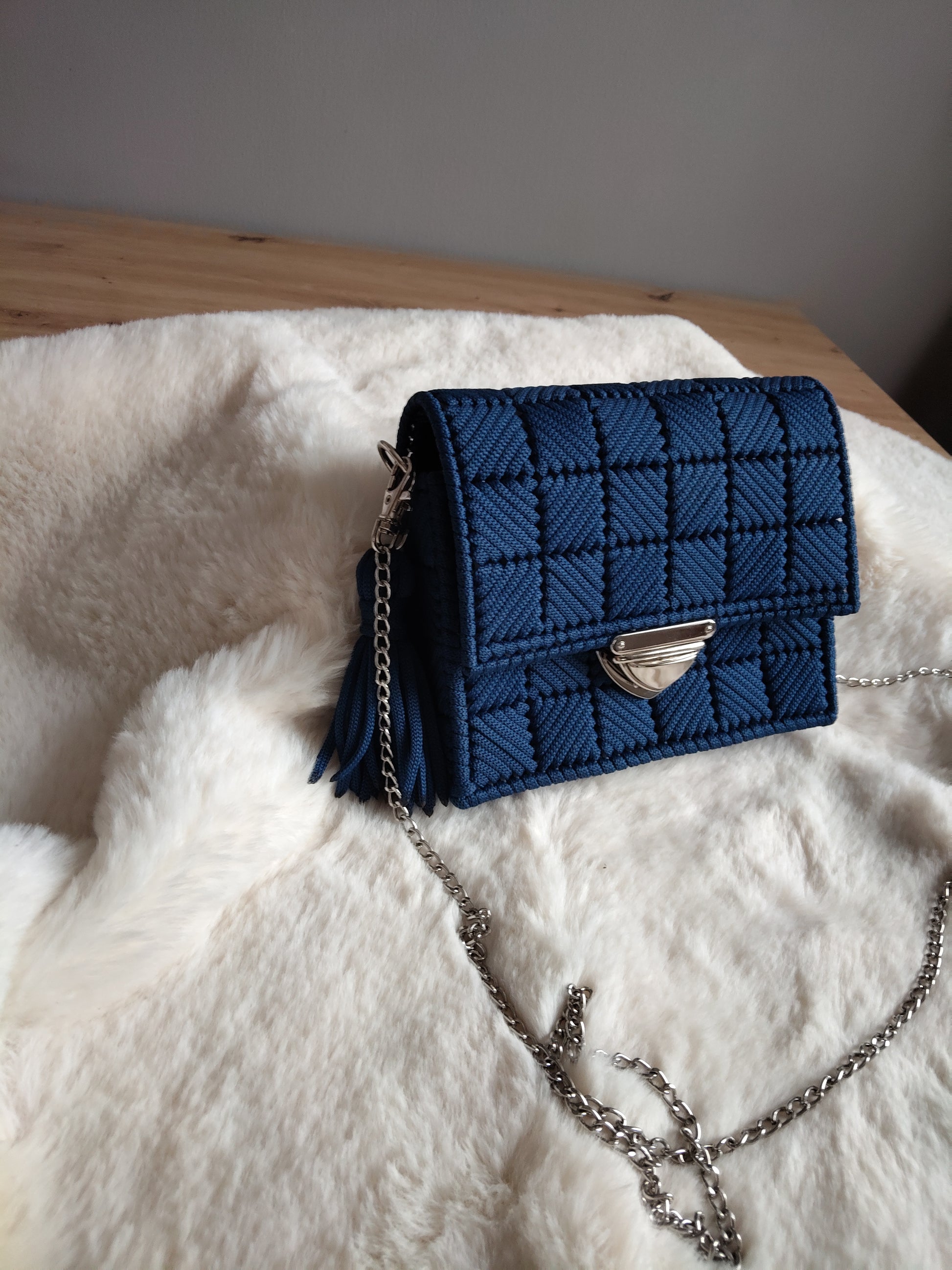 Kabelka Larg robená z platovej mriežky vypletaná polyesterovou šnúrkou v kráľovskej modrej farbe. ozdobné strieborné zapínanie.