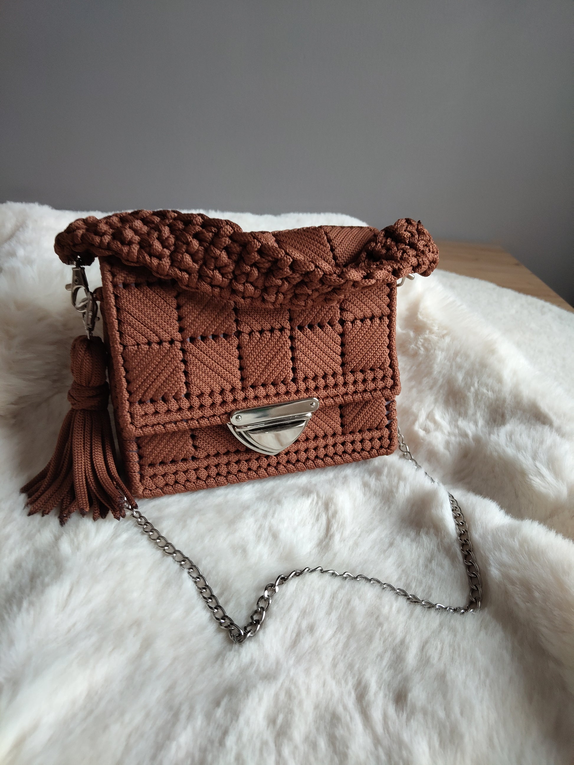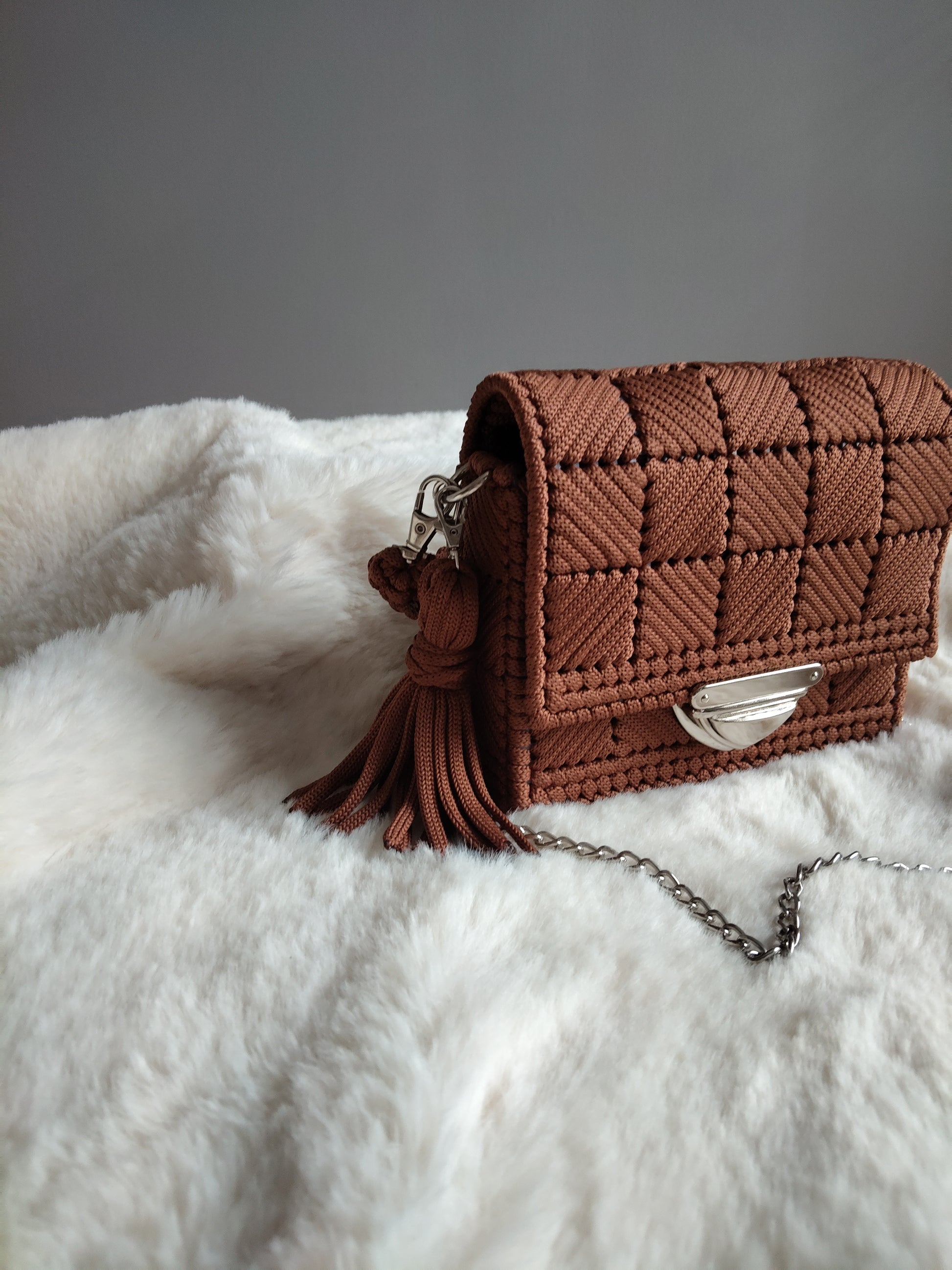 Kabelka Larg robená z plastovej mriežky vyplataná polyesterovou šnúrkou v hnedej farbe, ozdobné strieborné zapínanie.