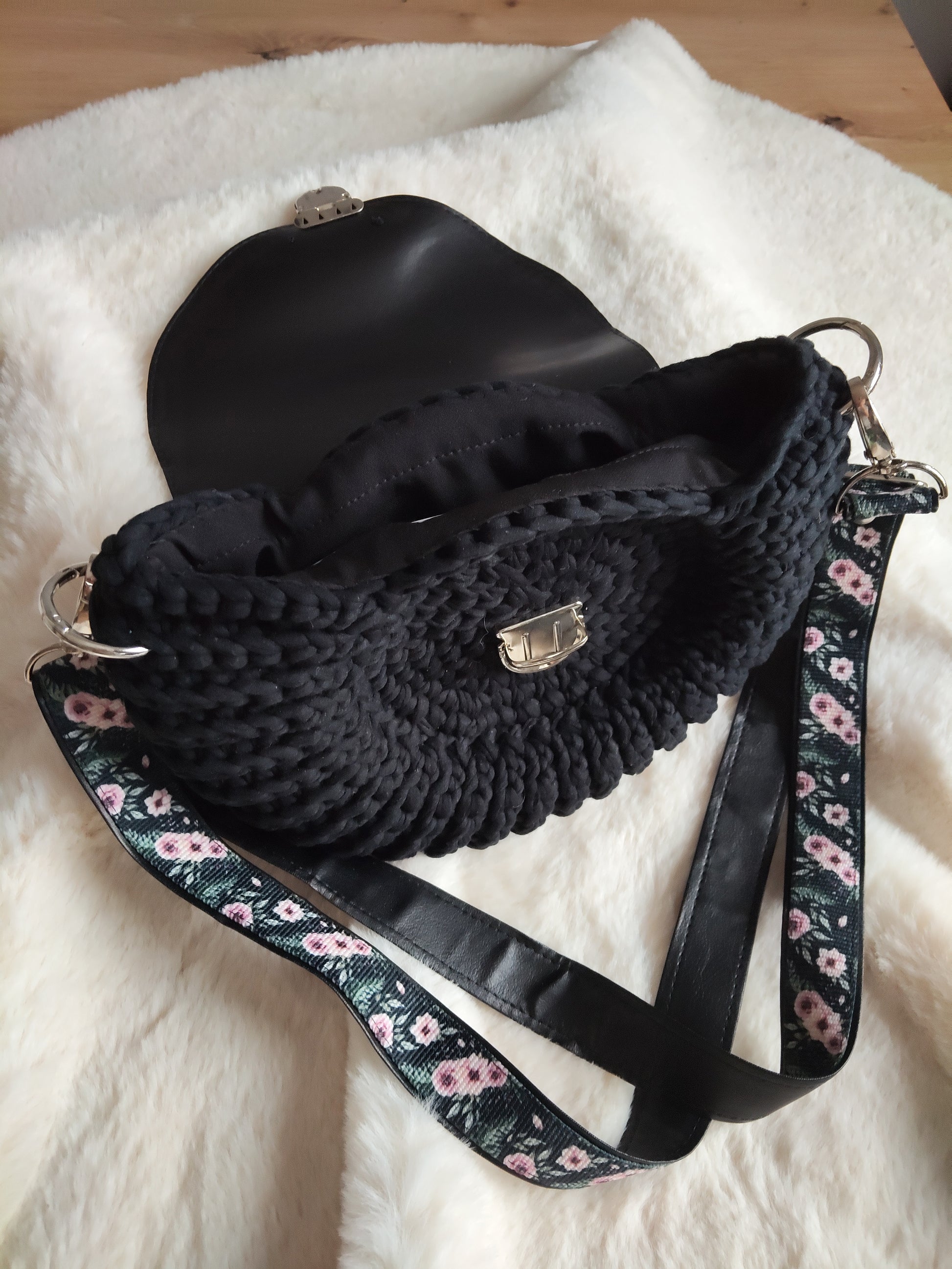Kabelka Oreo Flop z bavlnenej tričkoviny v čiernej farbe a koženým klopom, strieborné doplnky.