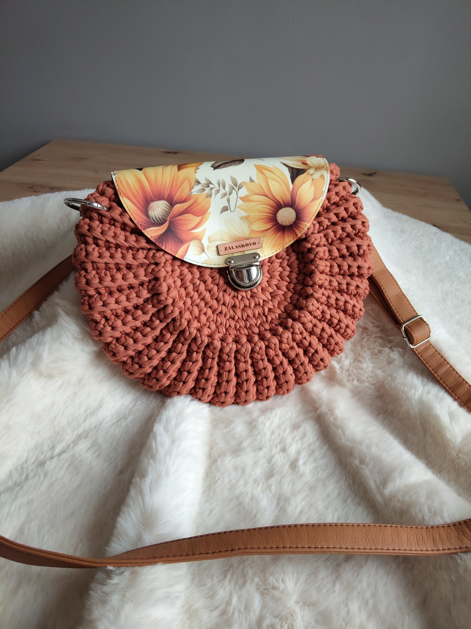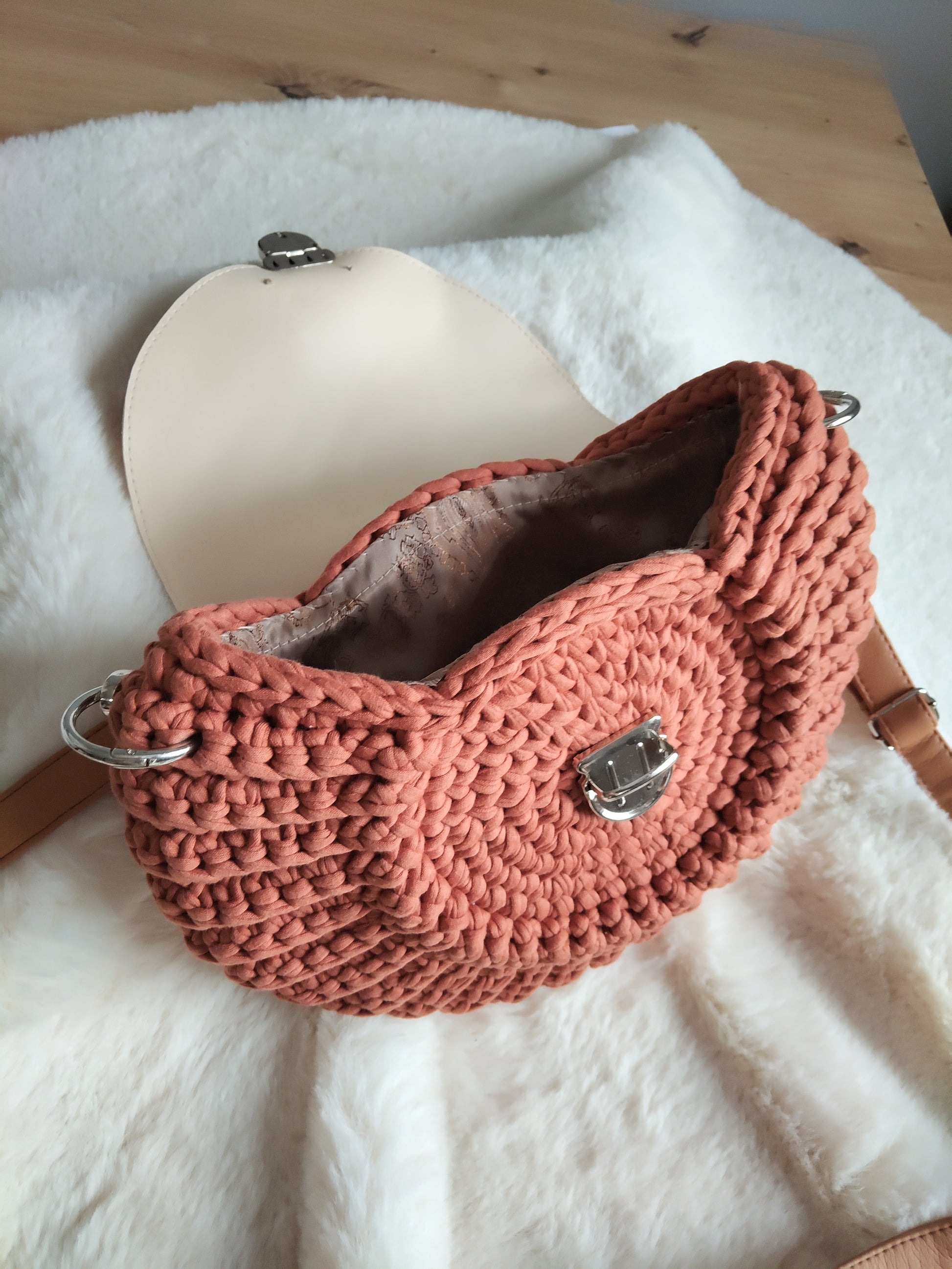 Kabelka Oreo Flop z bavlnenej tričkoviny a koženým klopom v tehlovej farbe, strieborné kovové doplnky.