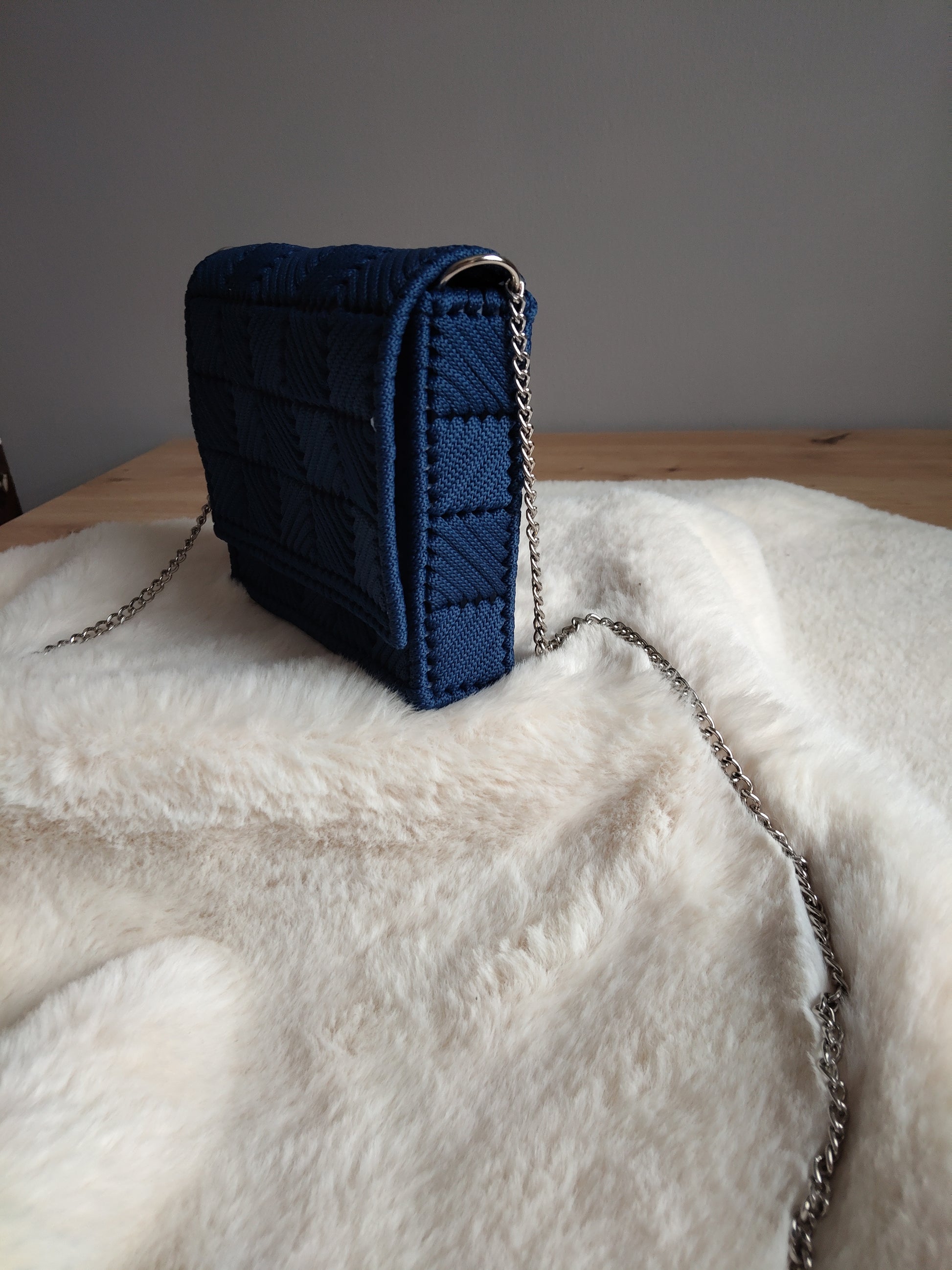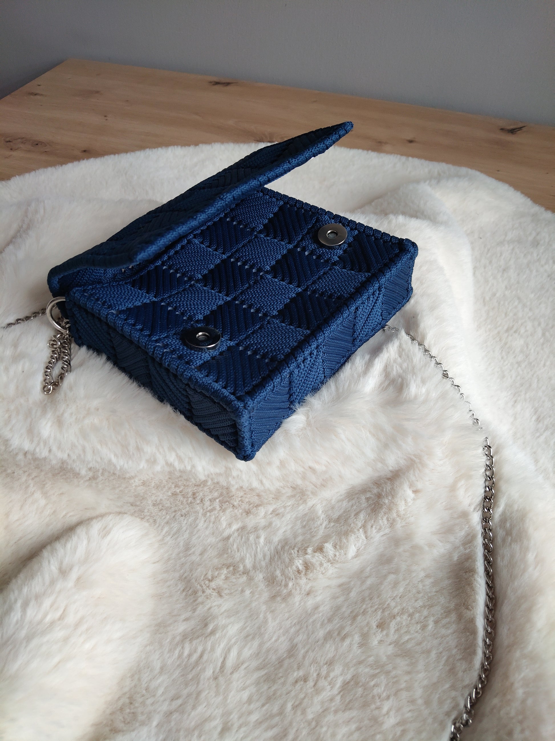 Kabelka Uni robená z plastovej mriežky vyplataná polyesterovou šnúrkou v kráľovskej modrej farbe, magnetické zapínanie.
