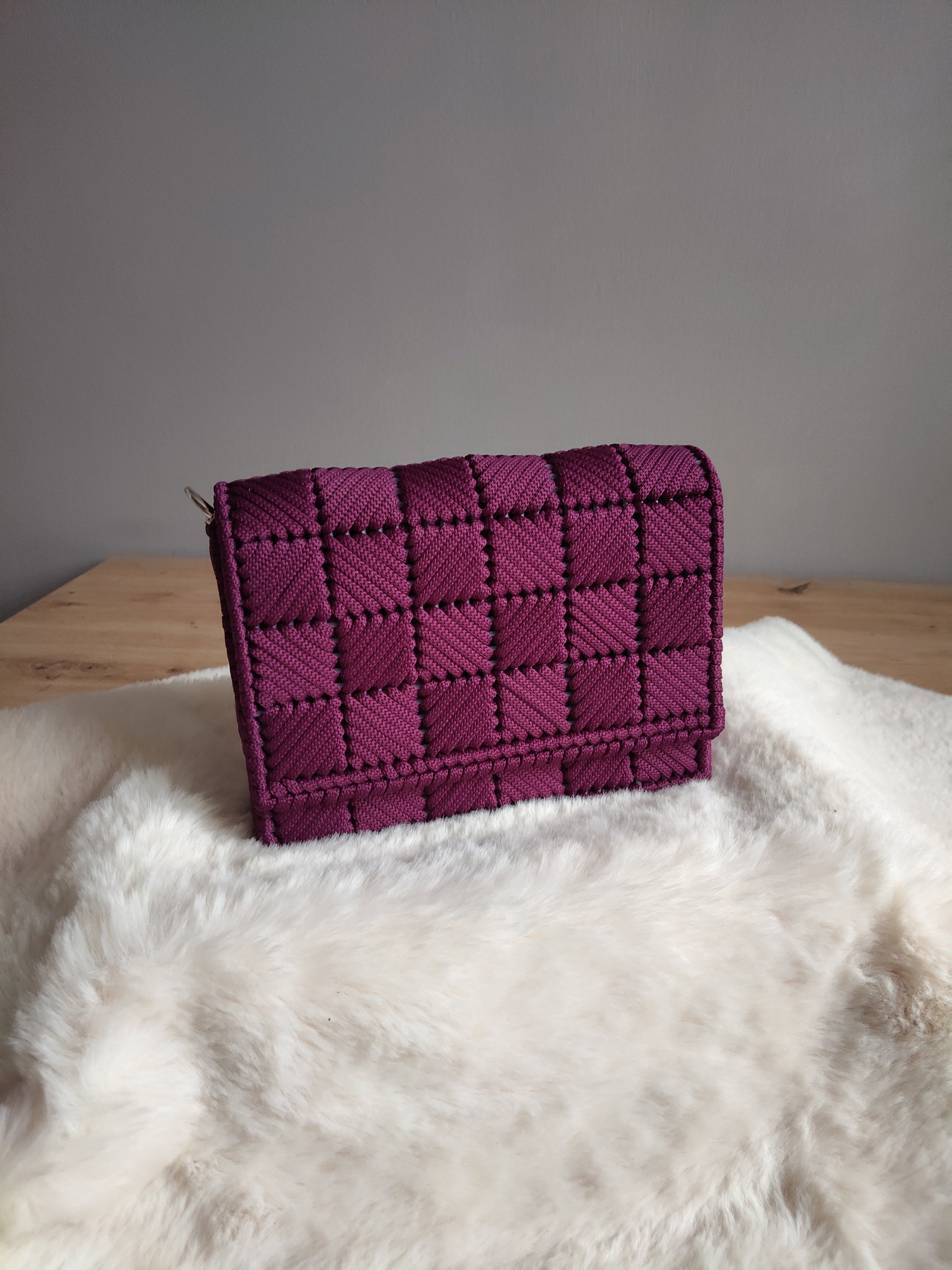 Kabelka Unive robená z plastovej mriežky vypletaná polyesterovou šnúrkou v ostružinovej farbe, magnetické zapínanie.